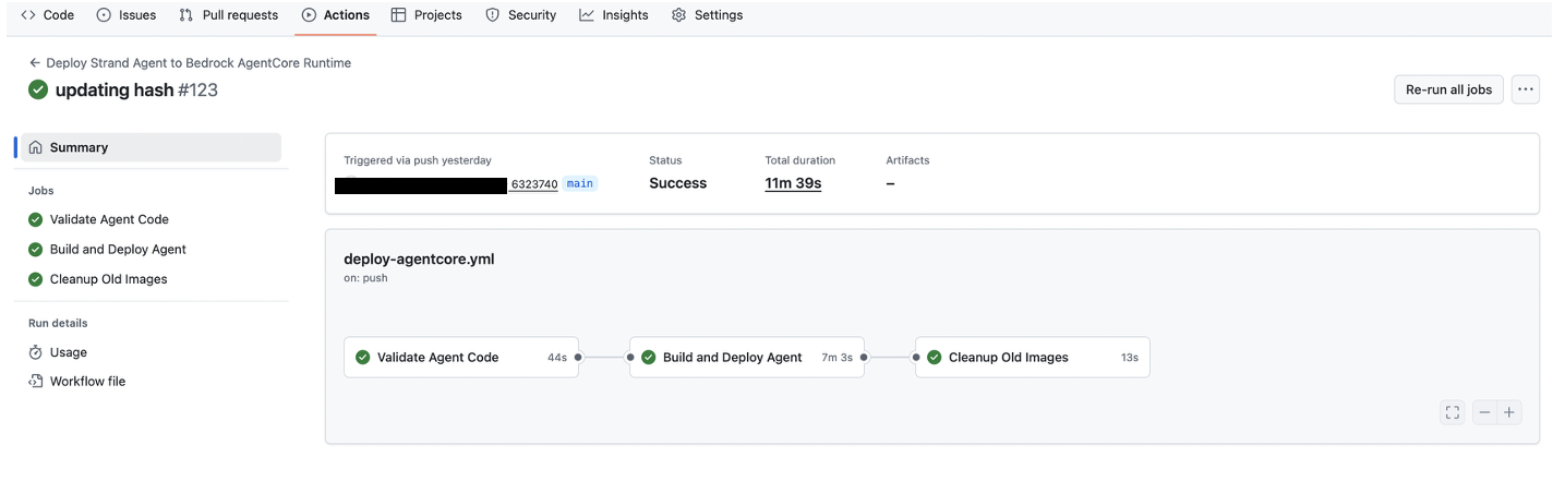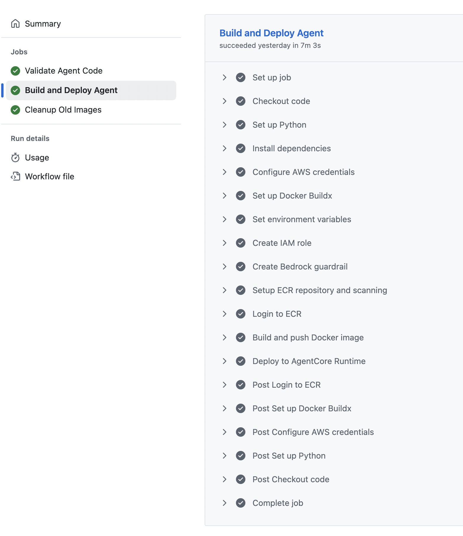 This pipeline can be triggered either by changing a code in the agents folder or manually using the workflow dispatch option. This might further change according to your organization’s branching strategy. Update the code in .github/workflows/deploy-agentcore.yml to change this trigger behavior.