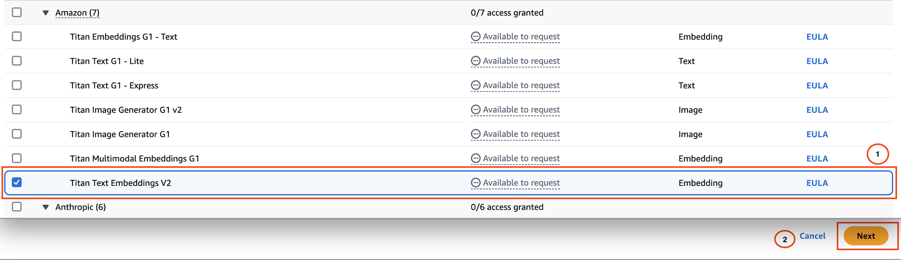 Make sure you have enabled access to a foundation model (FM) in Amazon Bedrock for generating embeddings. The solution uses the Titan Text Embeddings V2 model by default. You can complete the following steps to enable model access in Amazon Bedrock: