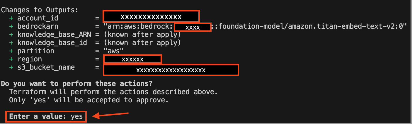 , Terraform automatically creates a plan and prompts you to approve it before executing the configuration changes.The following image shows what the output prompt and changes to output variables will look like: