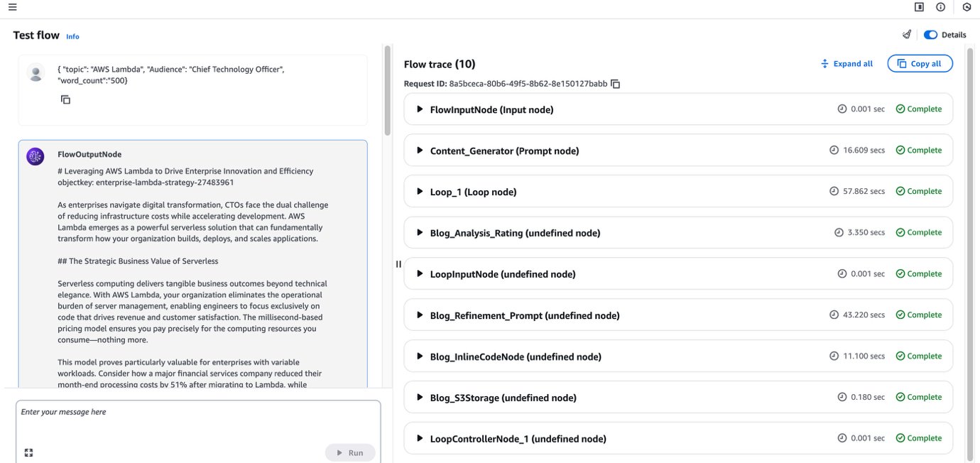 You can see the output as shown in the following screenshot. The system also provides access to node execution traces, offering detailed insights into each processing step, real-time performance metrics, and highlighting issues that may have occurred during the flow’s execution. Traces can be enabled using an API and sent to an Amazon CloudWatch log. In the API, set the enableTrace field to true in an InvokeFlow request. Each flowOutputEvent in the response is returned alongside a flowTraceEvent.