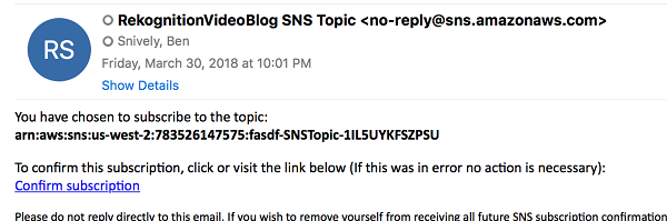 When you launch the CloudFormation script, it will automatically use the email address you entered as part of the SNS subscription. You should see a message like this to confirm:
