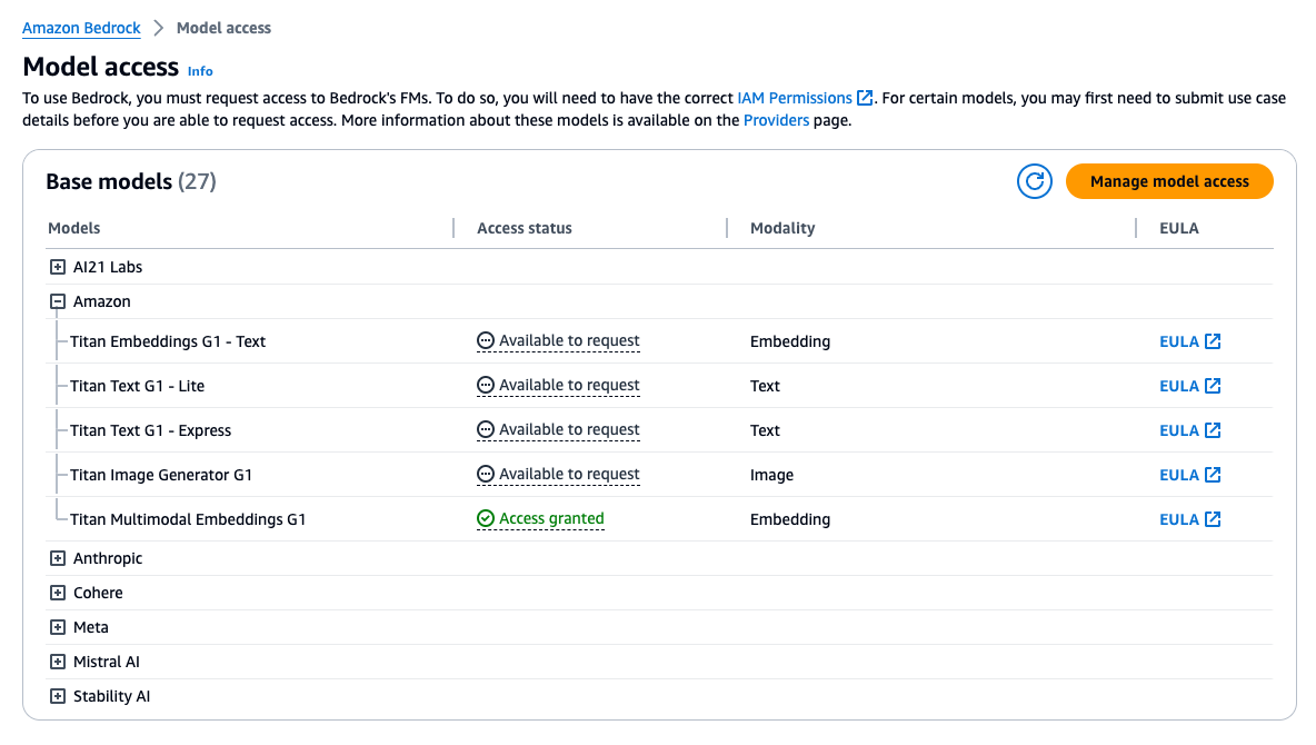 - The Amazon Titan Multimodal Embeddings model enabled in Amazon Bedrock. You can confirm it’s enabled on the Model access page of the Amazon Bedrock console. If Amazon Titan Multimodal Embeddings is enabled, the access status will show as Access granted, as shown in the following screenshot. You can enable access to the model by choosing Manage model access, selecting Amazon Titan Multimodal Embeddings G1, and then choosing Save Changes.