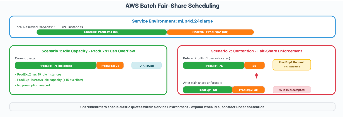 Share Identifiers. We used Share Identifiers to allocate fractions of a service environment’s capacity to production experiments. Share Identifiers are string tags applied at job submission time. AWS Batch used these tags to track usage and enforce fair-share scheduling. For initiatives that required dedicated capacity, we defined preset Share Identifiers with quotas in AWS Batch. This reserved capacity for production tracks. These quotas acted as fairness targets rather than hard limits. Idle capacity could still be borrowed, but under contention, AWS Batch enforced fairness by preempting resources from overused identifiers and reassigned them to underused ones.