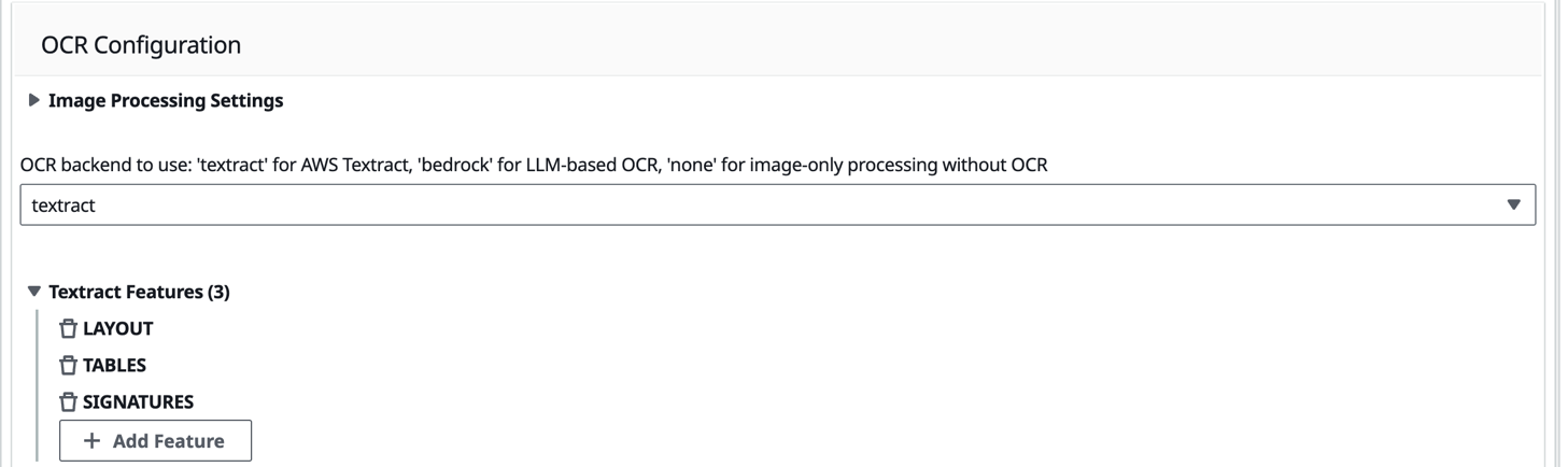 To address checkbox identification challenges, we enabled Amazon Textract’s specialized TABLES and FORMS features on the GenAI IDP Accelerator portal as shown in the following image, to improve OCR discrimination between selected and unselected checkbox elements. These features enhanced the system’s ability to detect and interpret marking styles found in medical forms.