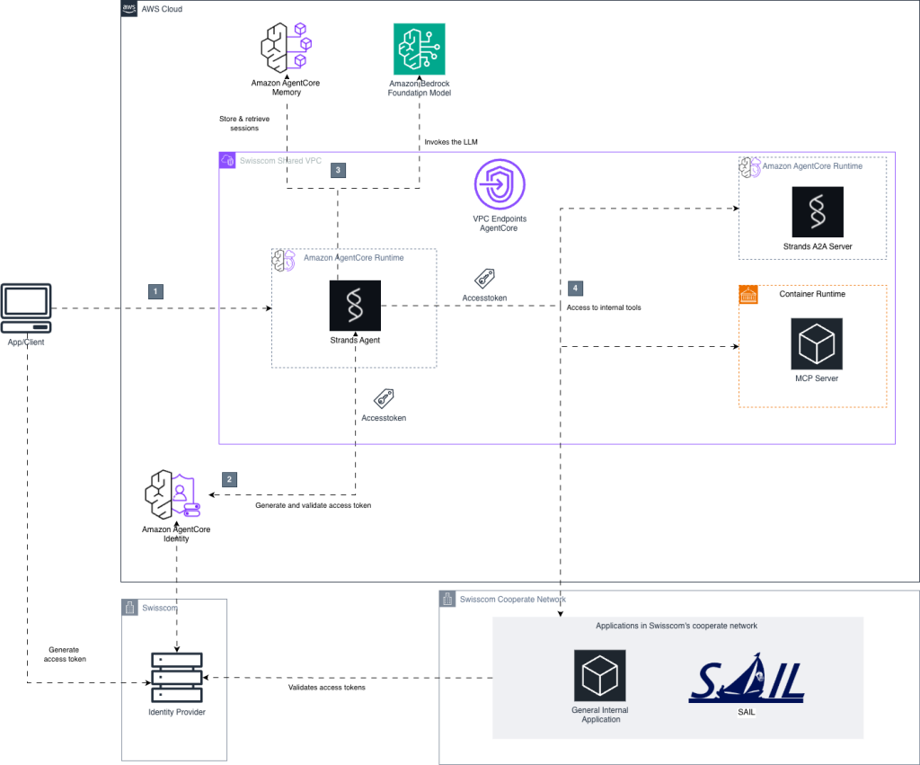 - The client sends a request to the Strands agent running on AgentCore Runtime, passing an authentication token from the Swisscom IdP.