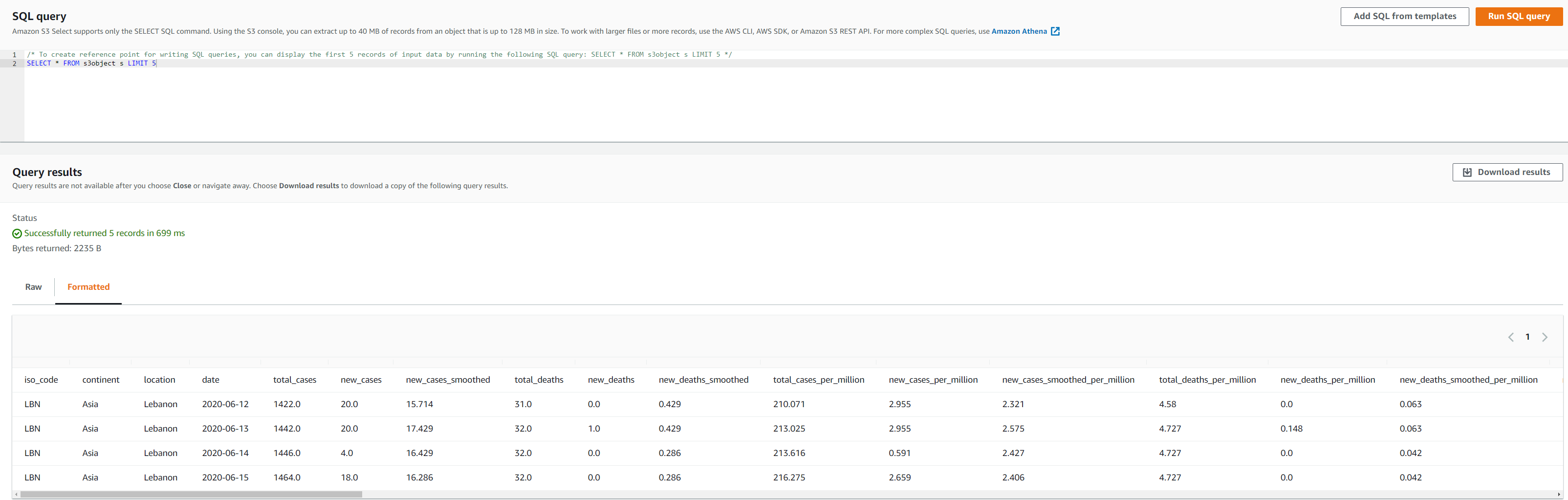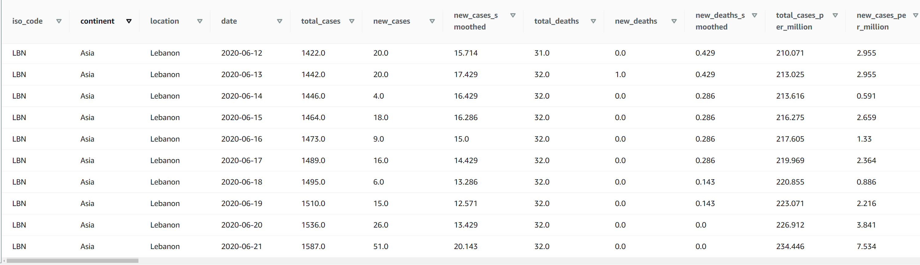 The dataset used for this post is a COVID-19 public dataset. The following screenshot shows an example of the data: