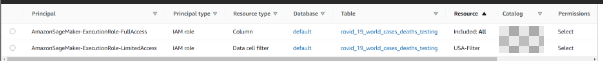 After you create the user profile and assign it to the appropriate role, you can access Lake Formation to crawl the data with AWS Glue, create the metadata and table, and grant access to the table data. For the AmazonSageMaker-ExecutionRole-FullAccess role, you grant access to all of the columns in the table, and for AmazonSageMaker-ExecutionRole-LimitedAccess, you grant access using the data filter USA_Filter. We use this filter to provide row-level and cell-level column permissions (see the Resource column in the following screenshot).