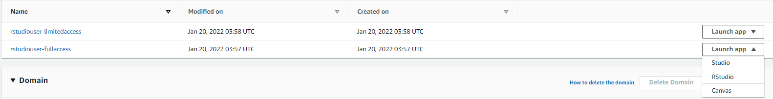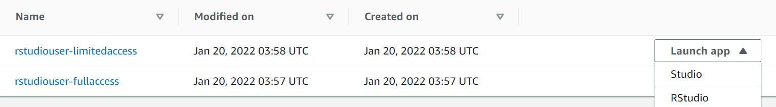 With role permissions attached to each user profile, we can see how Lake Formation enforces the appropriate row-level and column-level permissions. You can open the RStudio Workbench from the Launch app drop-down menu in the created user list, and choose RStudio.