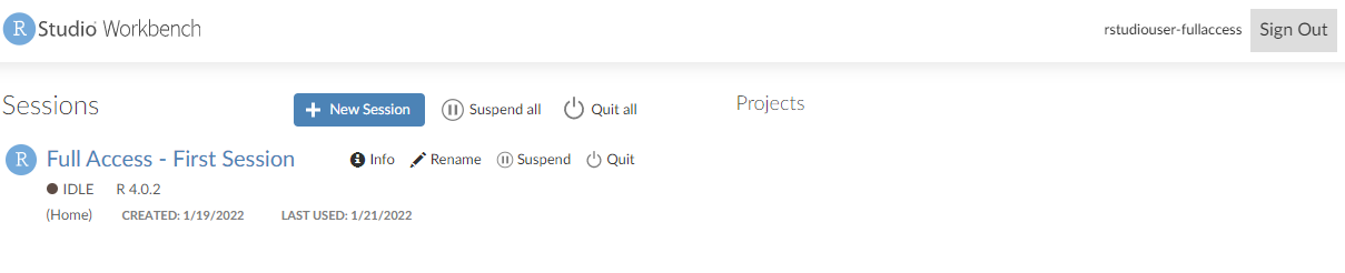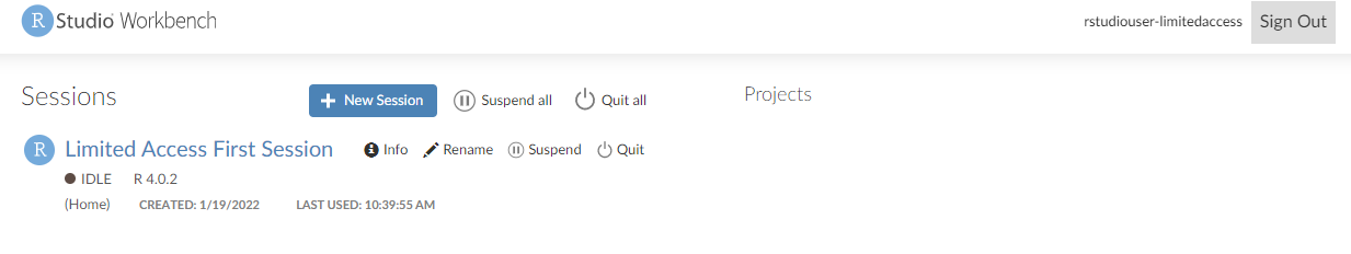 You can see the RStudio Workbench home page and a list of sessions, projects, and published content.