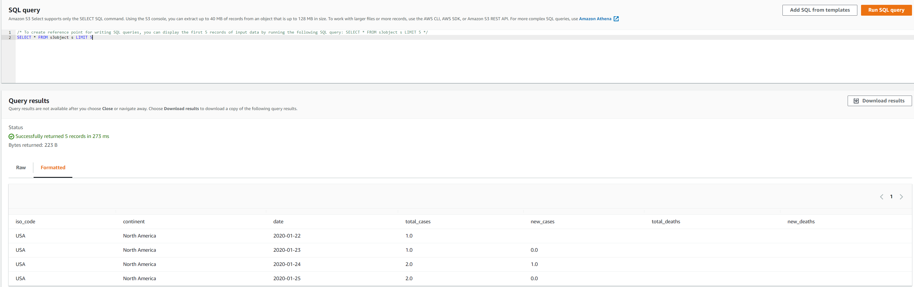 The following screenshot shows the data in these output files using Amazon S3 Select.