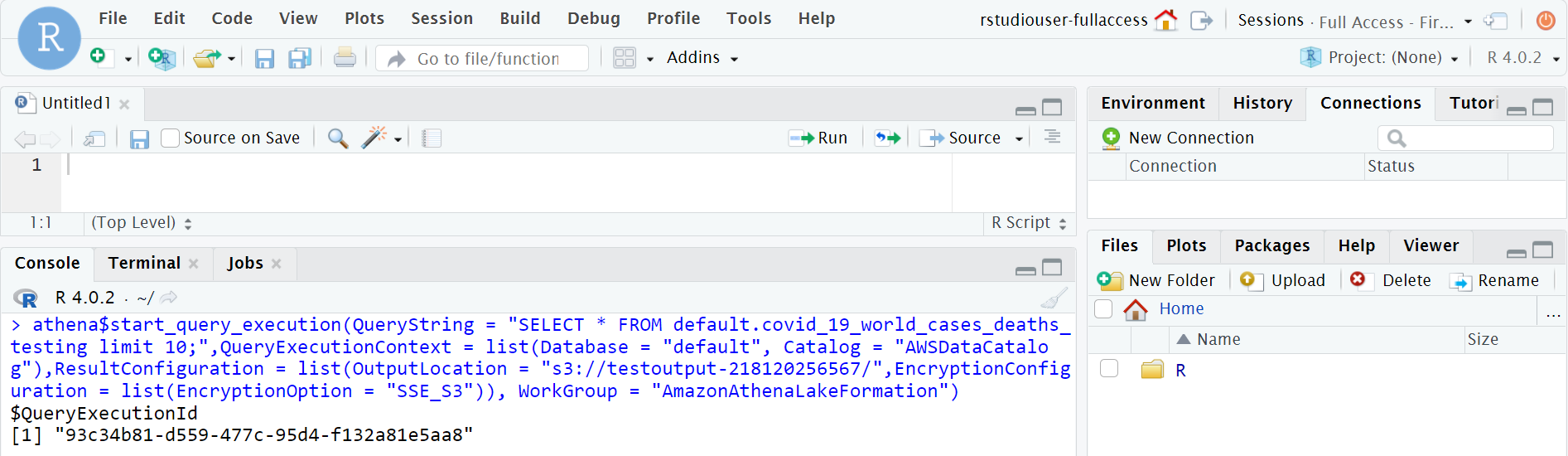 After you access the RStudio session, you should install the R Package for AWS (Paws). This lets you connect to many AWS services, including the services and resources in your data lake. To install Paws, enter and run the following R code: