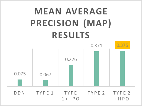 A larger mAP score implies a higher accuracy of the model test results. Clearly, the Type 2 (latest) models outperforms the Type 1 (legacy) models in regards to accuracy, with or without using HPO. Type 2 with HPO has a slighter edge (mAP 0.375) over one without HPO (mAP 0.371).