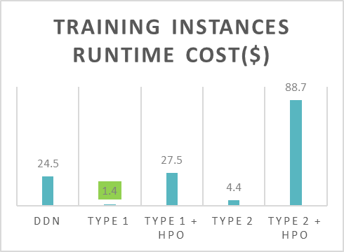 Training and validation loss is just one of the metrics needed to pick the best model for the use case. With so many options, it’s not always easy to make the right choice, and picking the best model boils down to the training time, cost of infrastructure, complexity, and quality of the resulting model, among other factors. There are other extraneous costs such as platform and personnel costs that we don’t take into account for this study.