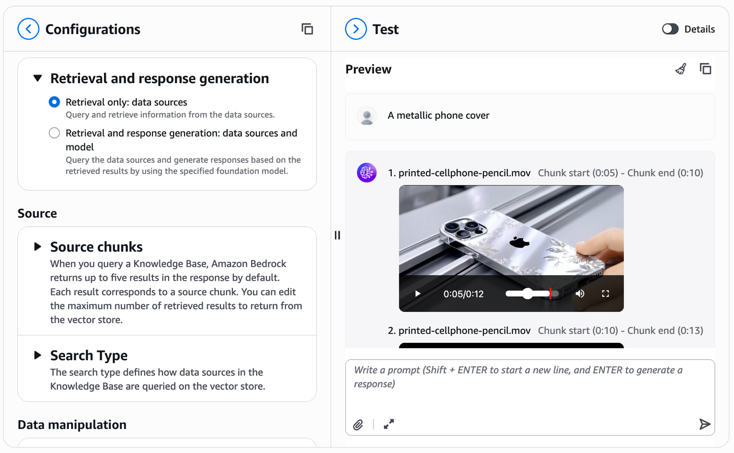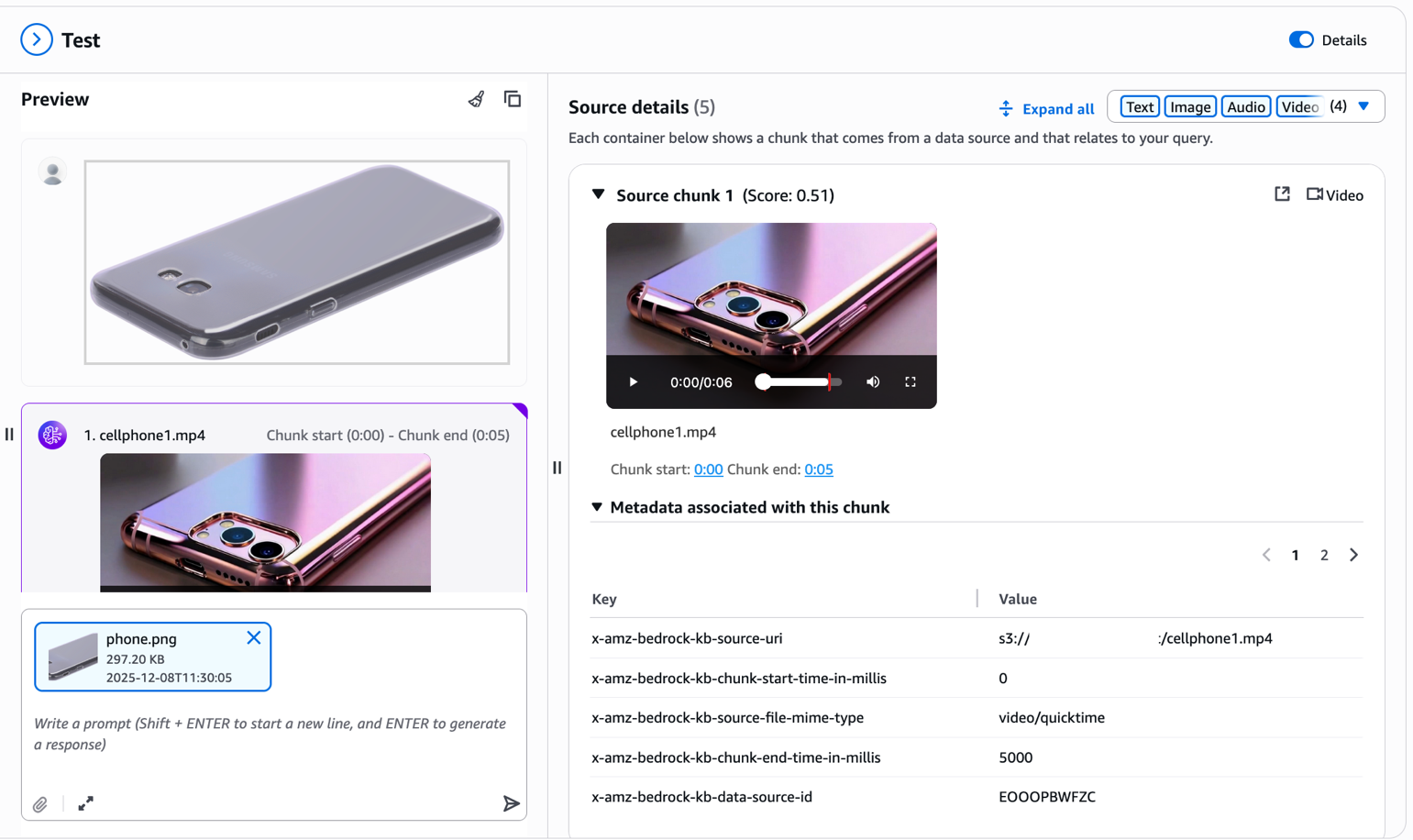 The multimodal knowledge base extracts visual features from your uploaded image and retrieves visually similar products from your catalog. As you can see in the results, the system returns phone covers with similar design patterns, colors, or visual characteristics. Notice the metadata associated with each chunk in the Source details panel. The x-amz-bedrock-kb-chunk-start-time-in-millis and x-amz-bedrock-kb-chunk-end-time-in-millis fields indicate the exact temporal location of this segment within the source video. When building applications programmatically, you can use these timestamps to extract and display the specific video segment that matched the query, enabling features like “jump to relevant moment” or clip generation directly from your source videos. This cross-modal capability transforms the shopping experience—customers no longer need to describe what they’re looking for with words; they can show you.