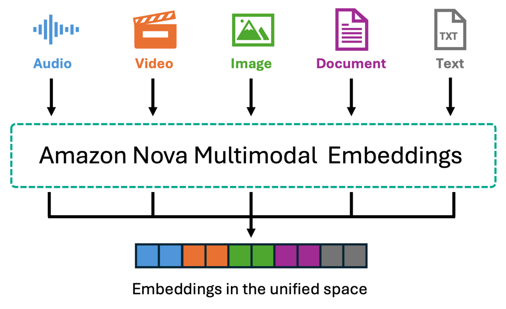 Amazon Nova Multimodal Embeddings is the first unified embedding model that encodes text, documents, images, video, and audio into a single shared vector space. Content is processed natively without text conversion. The model supports up to 8,172 tokens for text and 30 seconds for video/audio segments, handles over 200 languages, and offers four embedding dimensions (with 3072-dimension as default, 1,024, 384, 256) to balance accuracy and efficiency. Bedrock Knowledge Bases segments video and audio automatically into configurable chunks (5-30 seconds), with each segment independently embedded.