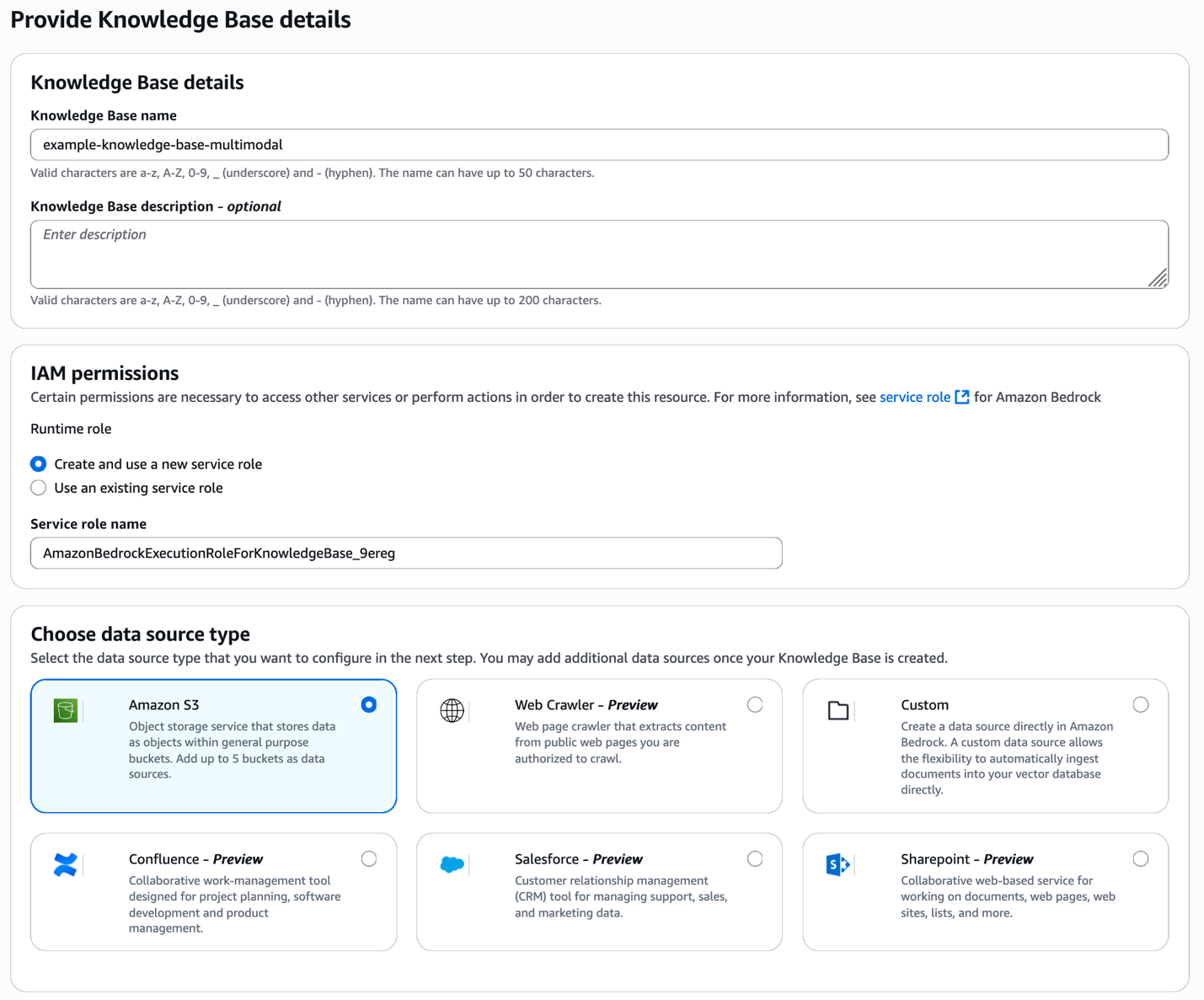 Start by opening the Amazon Bedrock console and creating a new knowledge base. Provide a descriptive name for your knowledge base and select your data source type—in this case, Amazon S3 where your product images and videos are stored.