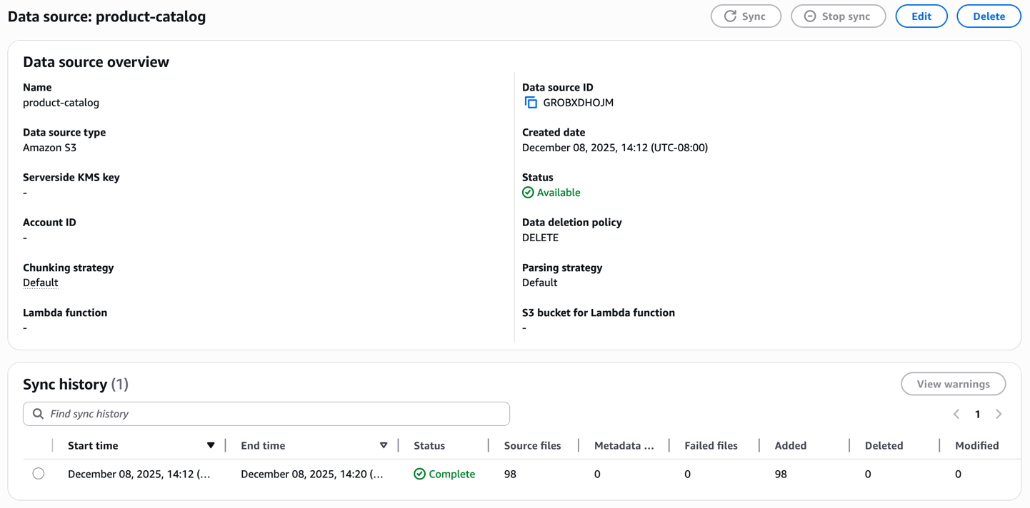 Once created, initiate the sync process to ingest your product catalog. The knowledge base processes each image and video, generates embeddings and stores them in the managed vector database. Monitor the sync status to confirm the documents are successfully indexed.
