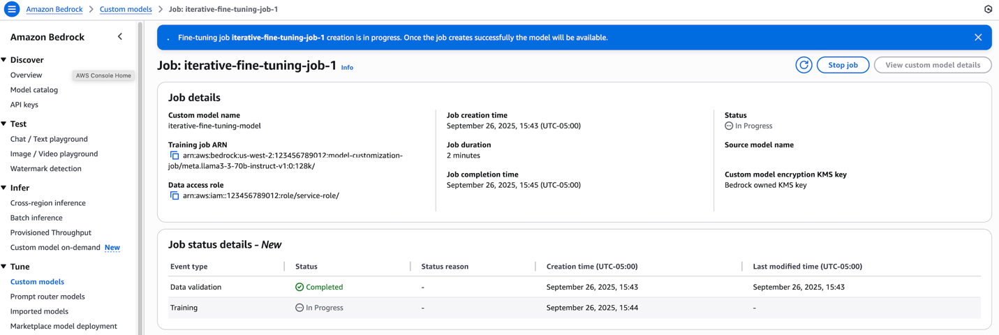 The Amazon Bedrock console provides a straightforward interface for creating iterative fine-tuning jobs.