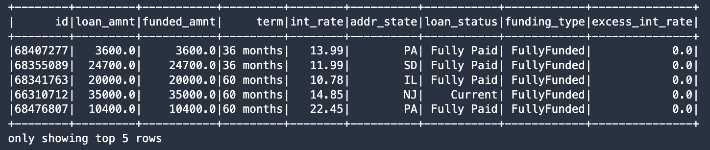 Now we use the Spark DataFrame API to add two new columns to our dataset. The column names are funding_type and excess_int_rate, and the column values are set to constants using the DataFrame withColumn method. See the following code: