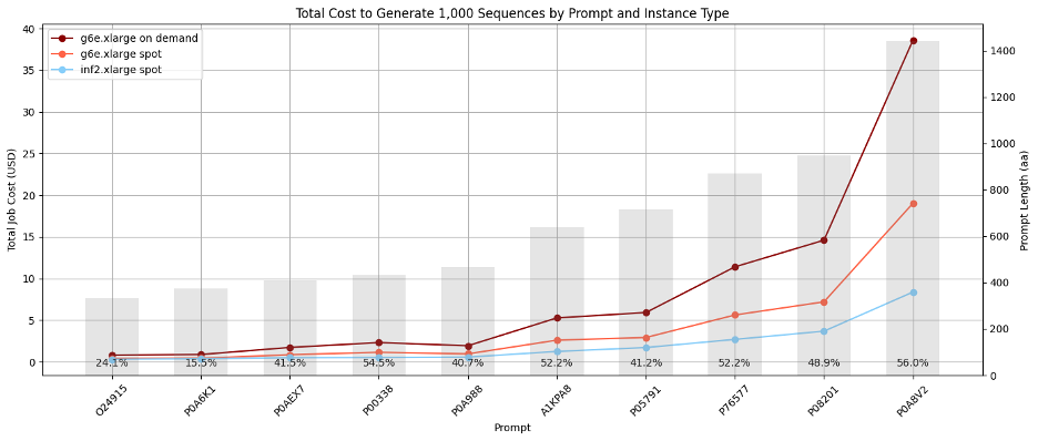The primary goal of this project was to lower the cost of generating protein sequences with Progen2, so that we could use this model to significantly expand the diversity of multiple enzyme classes. To compare the cost of generating sequences using both services, we generated 10,000 sequences based on prompts derived from 10 common sequences in UniProtKB, using a temperature of 1.0. Batch jobs were run in parallel, with each job generating 100 sequences for a single prompt. We observed that the implementation of Progen2 on EC2 Inf2 Spot Instances was significantly cheaper than implementation on Amazon EC2 G6e Spot Instances for longer sequences, representing savings of up to 56%. These cost estimates include expected Amazon EC2 Spot interruption frequencies of 20% for Amazon EC2 g6e.xlarge instances powered by NVIDIA L40S Tensor Core GPUs and 5% for EC2 inf2.xlarge instances. The following figure illustrates total cost where gray bars represent the average length of generated sequences.
