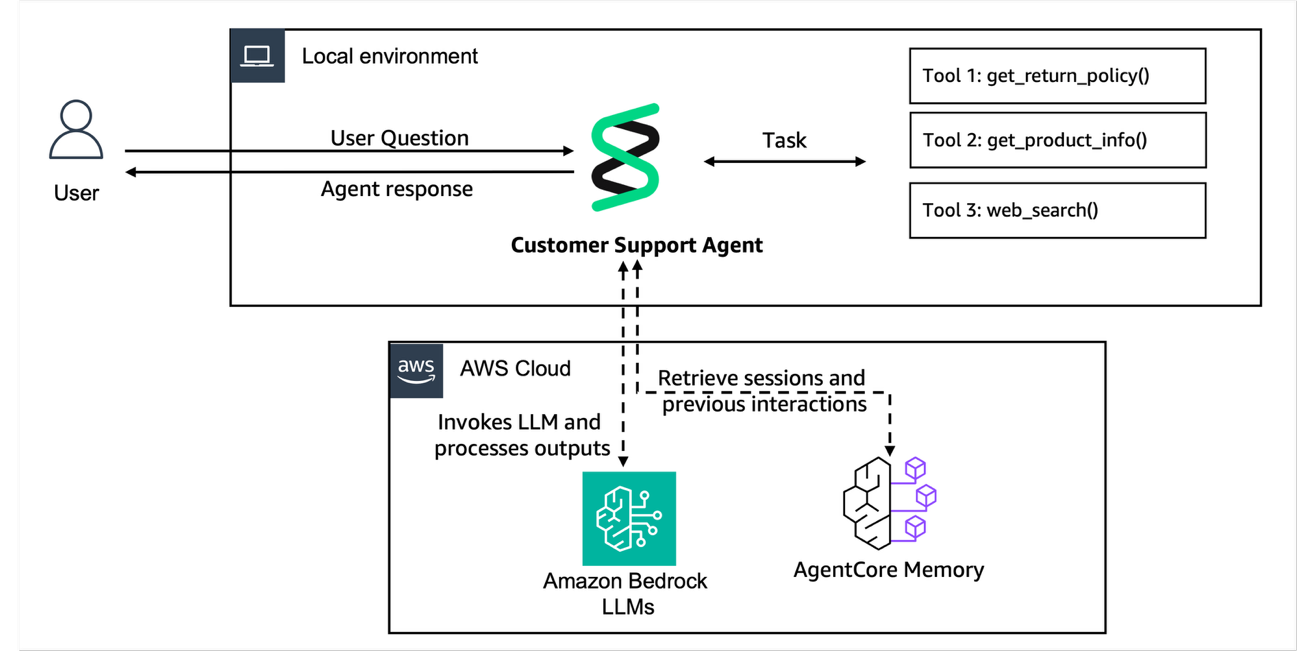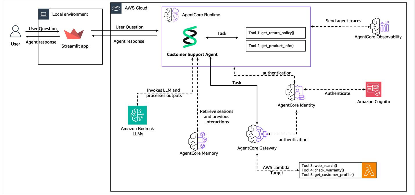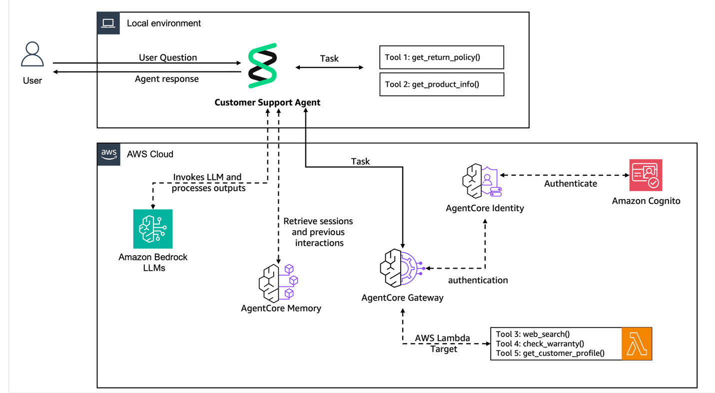 In this post, we address each challenge systematically. We start with a prototype agent equipped with three essential tools: return policy lookup, product information search, and web search for troubleshooting. From there, we add the capabilities needed for production deployment: persistent memory for conversation continuity and a hyper-personalized experience, centralized tool management for reliability and security, full observability for monitoring and debugging, and finally a customer-facing web interface. This progression mirrors the real-world path from proof of concept to production, demonstrating how Amazon Bedrock AgentCore services work together to solve the operational challenges that emerge as your agentic applications mature. For simplification and demonstration purposes, we consider a single-agent architecture. In real-life use cases, customer support agents are often created as multi-agent architectures and those scenarios are also supported by Amazon Bedrock AgentCore services.