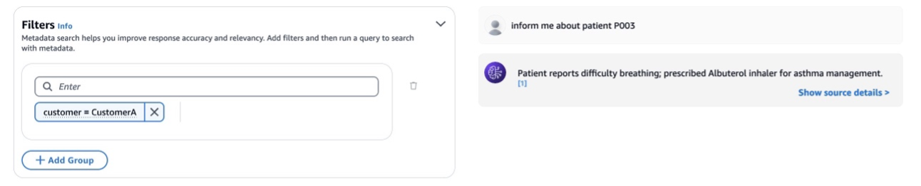 This structure makes sure that Customer A’s healthcare documentation remains completely separate from Customer B’s data. When combined with Amazon Bedrock Knowledge Bases metadata filtering, you can verify that users associated with Customer A can only access their organization’s documents, and Customer B’s users can only see their own data—maintaining strict data boundaries while using a single, efficient knowledge base infrastructure.