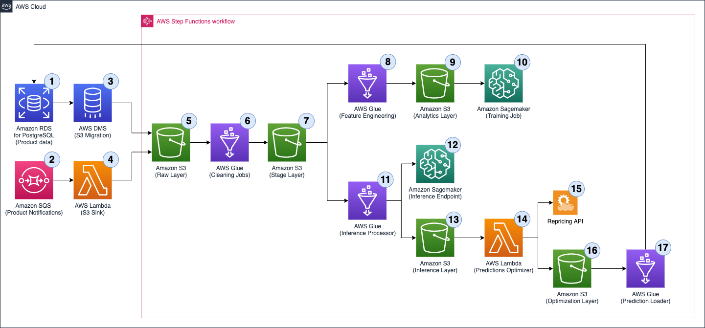 - The price recommendations generated by the Lambda predictions optimizer are submitted to the repricing API, which updates the product price on the marketplace.