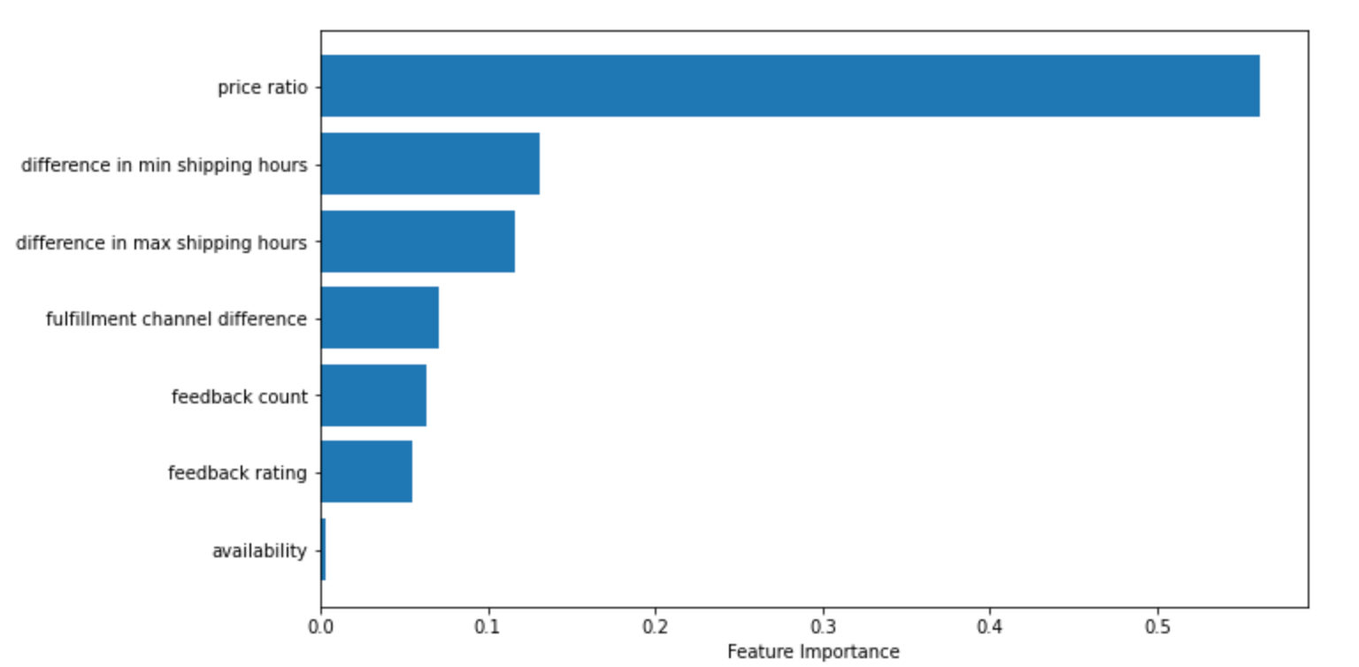 Our model classifies for each pair of offers, if a given offer will be visible. This model enables us to calculate the best price for our customers, increase visibility based on competition, and maximize their profit. On top of that, this classification model can give us deeper insights into the reasons for our listings being visible or not visible. We use the following features: