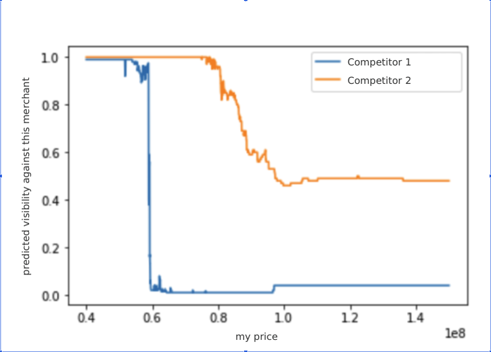 In this example, the visibility against Competitor 1 is almost a piecewise constant function, suggesting that we mainly have to decrease the price below a certain threshold, roughly the price of the competitor, to become visible. However, the visibility against Competitor 2 doesn’t decrease as steeply. On top of that, we still have a 50% chance of being visible even with a very high price. Analyzing the input data revealed that the competitor has a low amount of ratings, which happen to be very poor. Our model learned that this specific ecommerce platform gives a disadvantage to sellers with poor feedback ratings. We discovered similar effects for the other features, like fulfilment channel and shipping times.