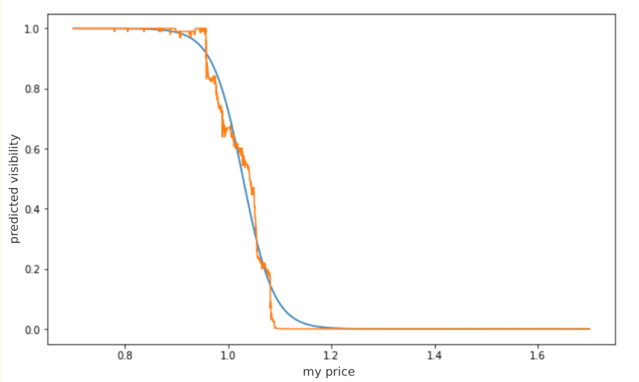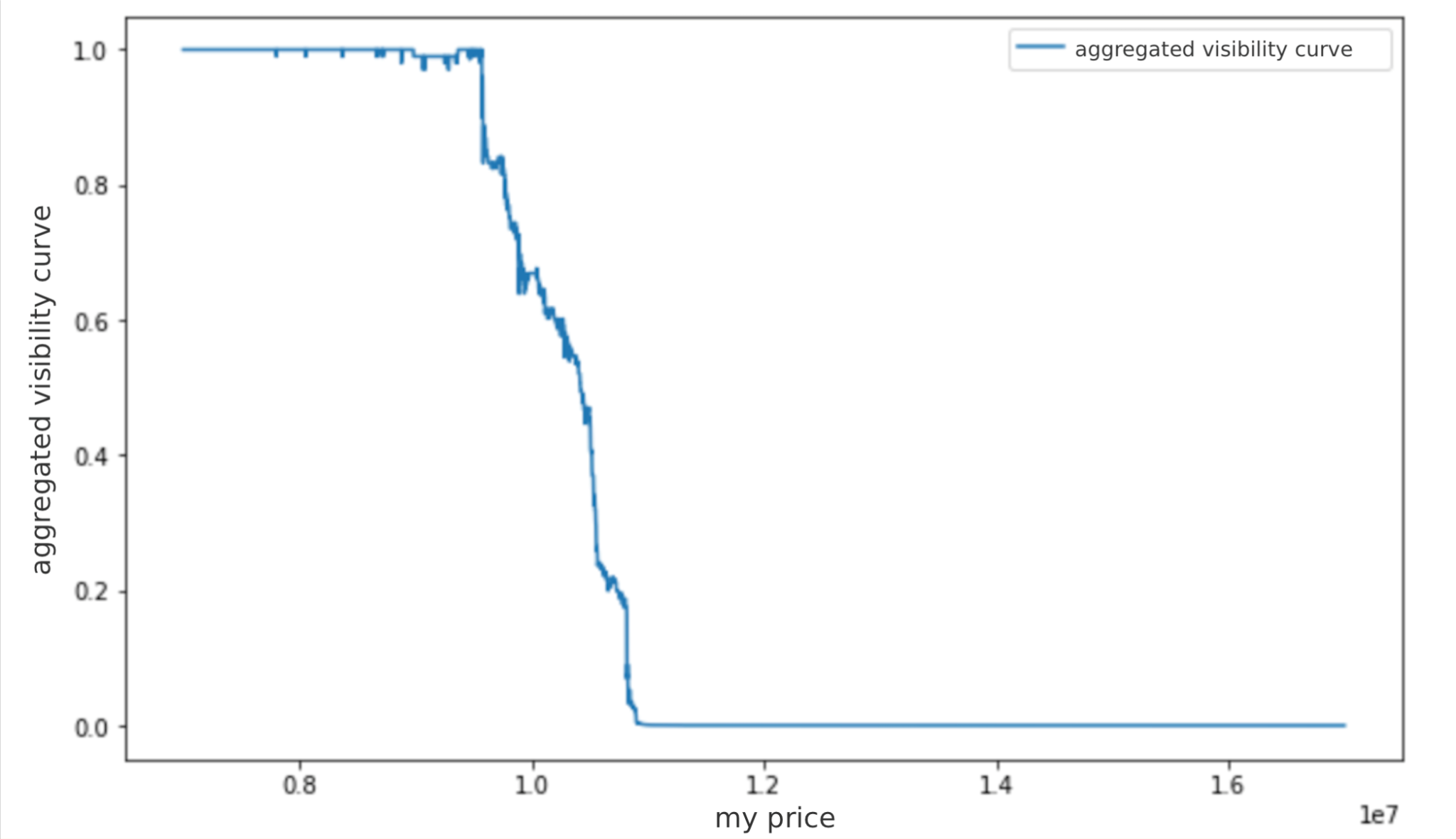 Finally, we want to calculate the aggregated visibility curve, which is the predicted visibility for each possible price. Our offer is visible if it’s better than all other sellers’ offers. Assuming independence between the probabilities of being visible against each seller given our price, the probability of being visible against all sellers is the product of the respective probabilities. That means the aggregated visibility curve can be calculated by multiplying all curves.