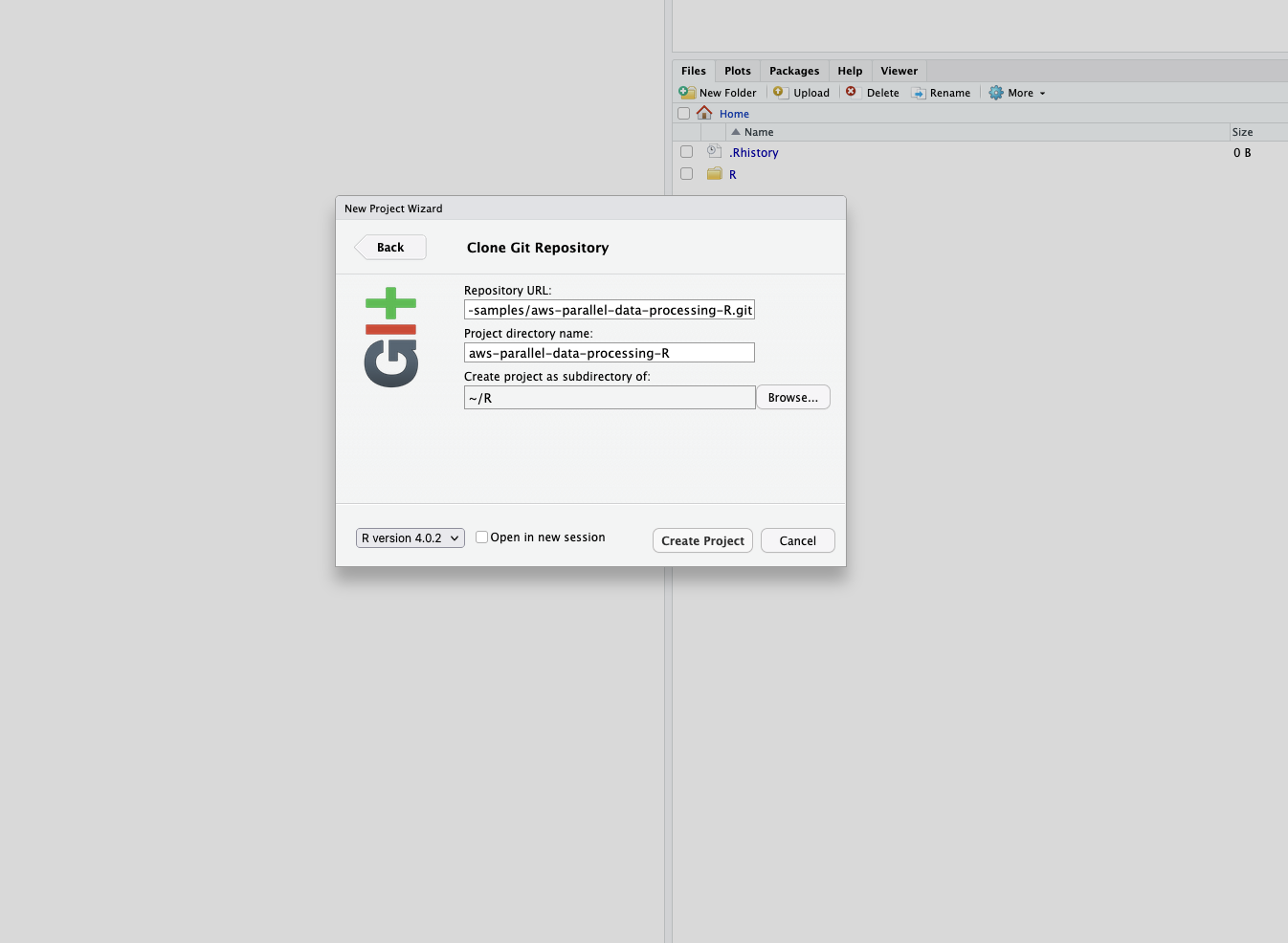 https://github.com/aws-samples/aws-parallel-data-processing-r.git - Leave the remaining options as default and choose Create Project.