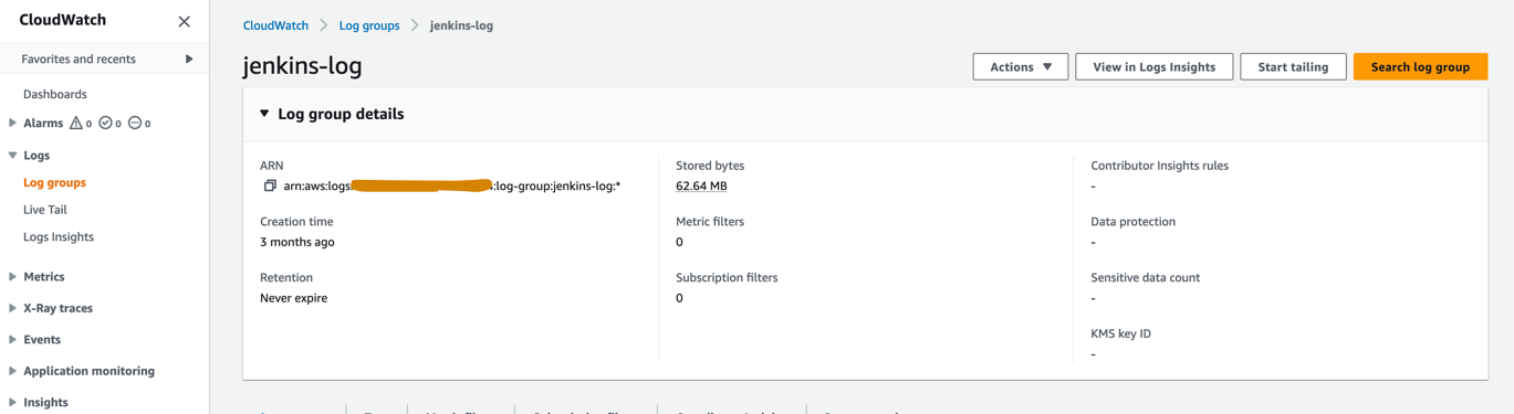 jenkins-logwithin the prod account to which Jenkins will push logs from the CI/CD pipeline. The log group should be created in the same Region as where the Jenkins server is set up.
