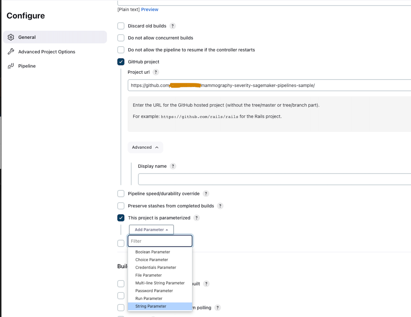 - On the General tab, select GitHub project and enter the forked GitHub repository URL.