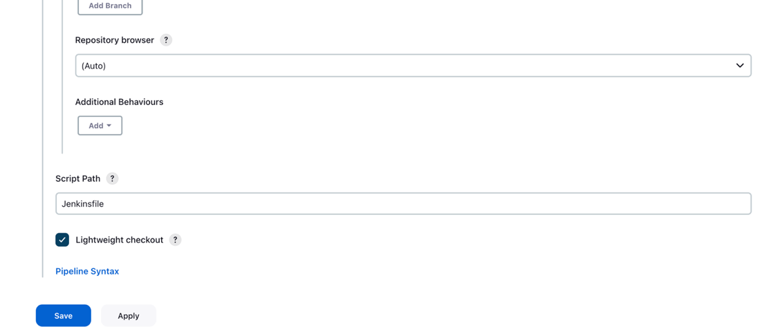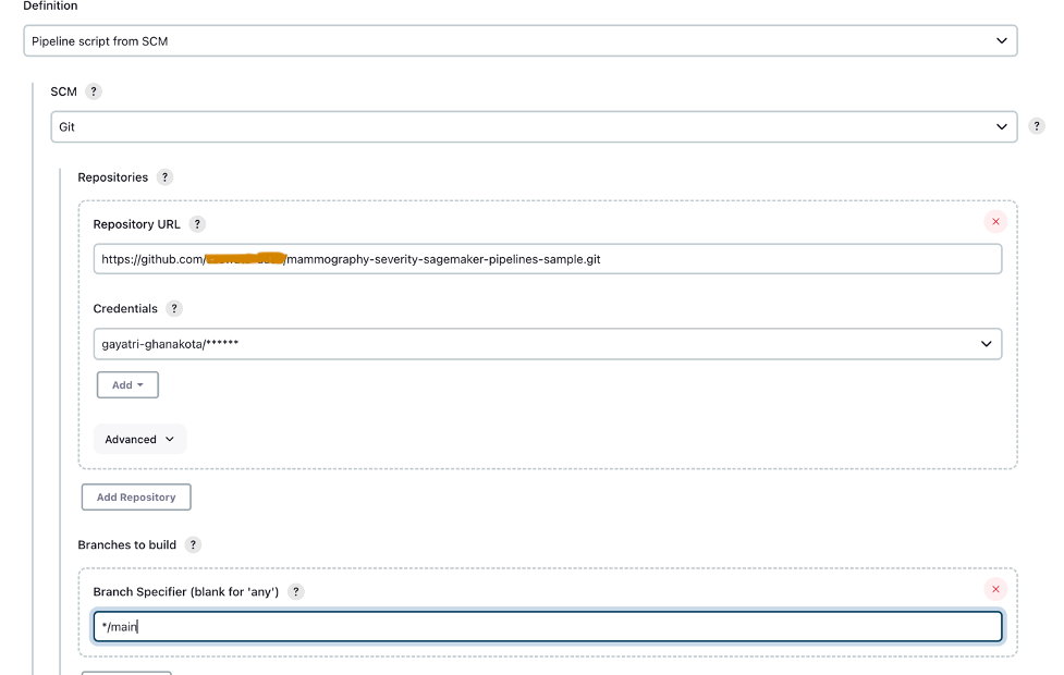 - Under Advanced Project Options, for Definition, select Pipeline script from SCM.
