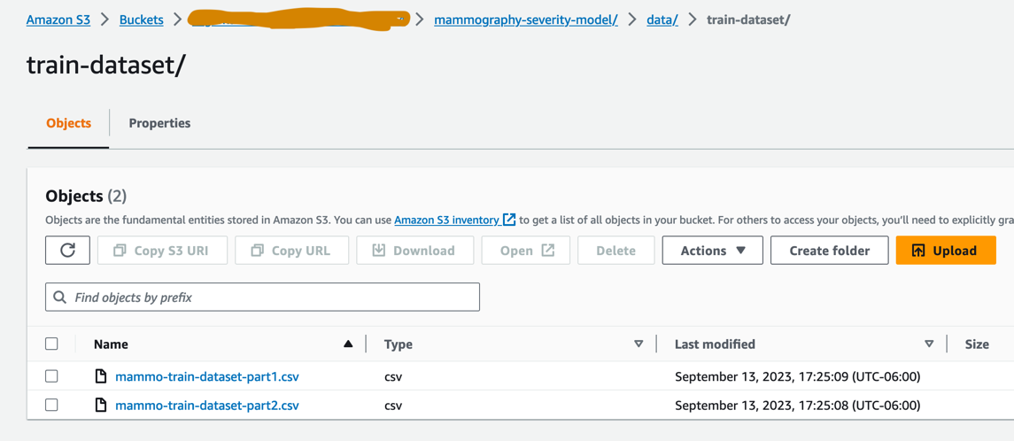 mammo-train-dataset-part1.csvandmammo-train-dataset-part2.csvunder the prefixmammography-severity-model/train-datasetinto the S3 bucket created in the prod account through the Amazon S3 console.