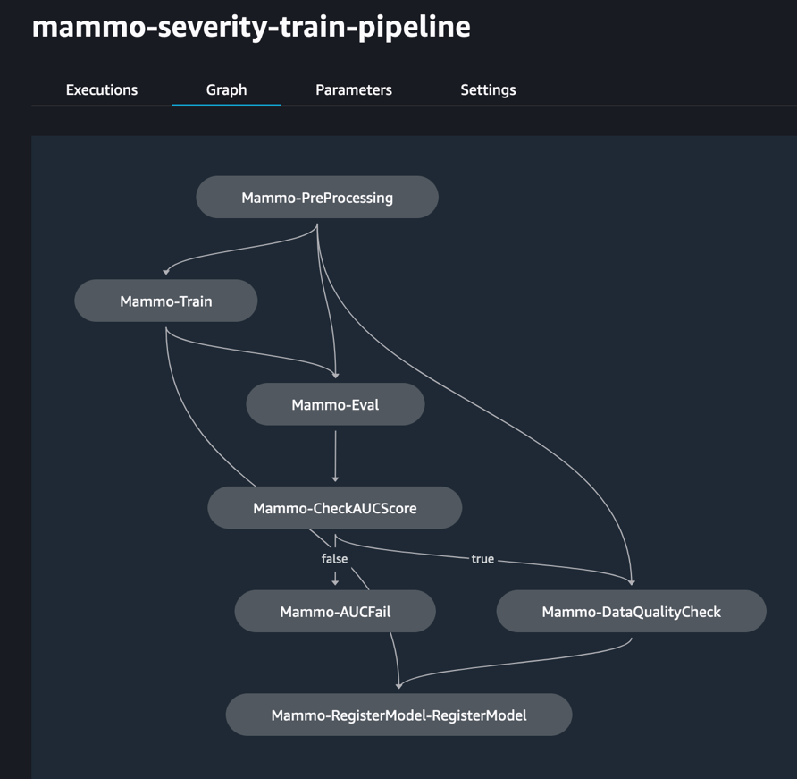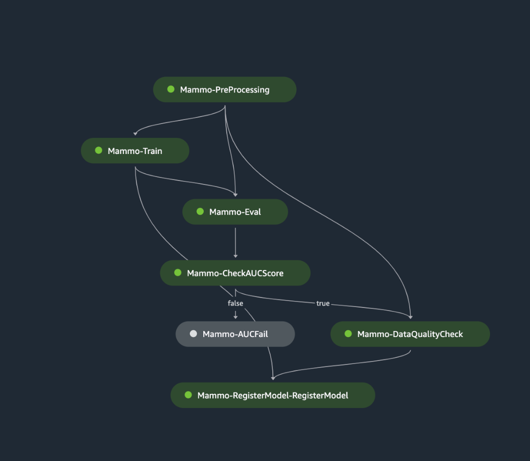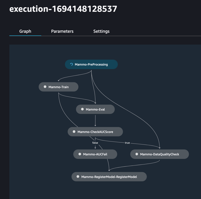 After a few moments, you should see a new run of the train pipeline on the SageMaker Pipelines console, which picks up the two different train datasets (mammo-train-dataset-part1.csv and mammo-train-dataset-part2.csv) uploaded to the S3 bucket to retrain the model.