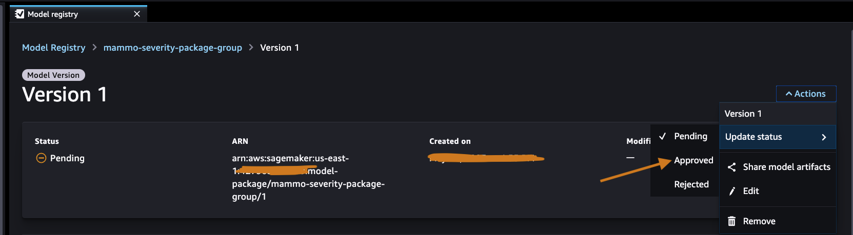 - Approve the model in SageMaker Model Registry in the central model registry account.