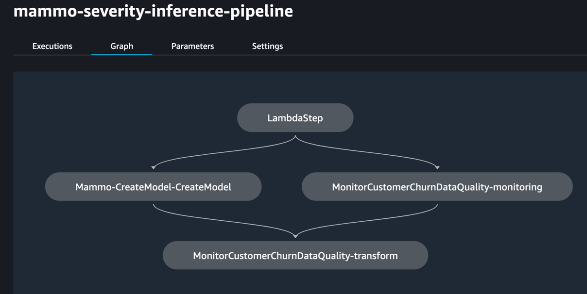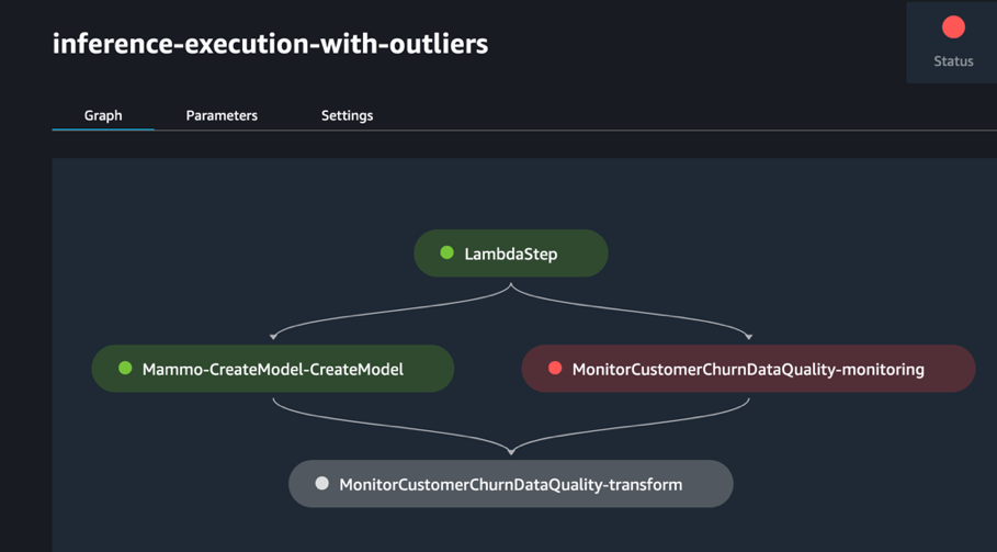 Run the pipeline via the SageMaker Pipelines console in the SageMaker Studio domain of the prod account, where the transform_input will be the S3 URI of the dataset with outliers (s3://<s3-bucket-in-prod-account>/mammography-severity-model/data/mammo-batch-dataset-outliers.csv).