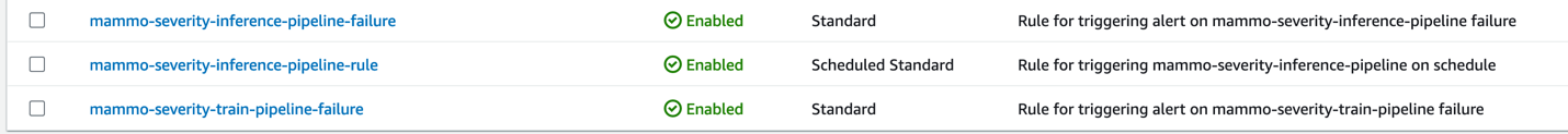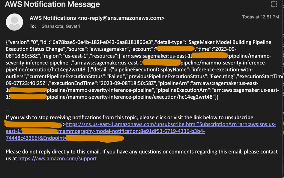 - Notifications are sent through the SNS topic whenever there is a failure with either the train or inference pipeline.