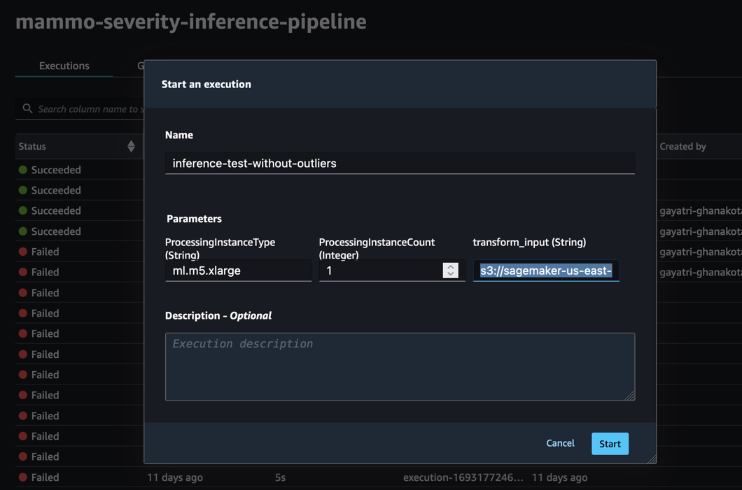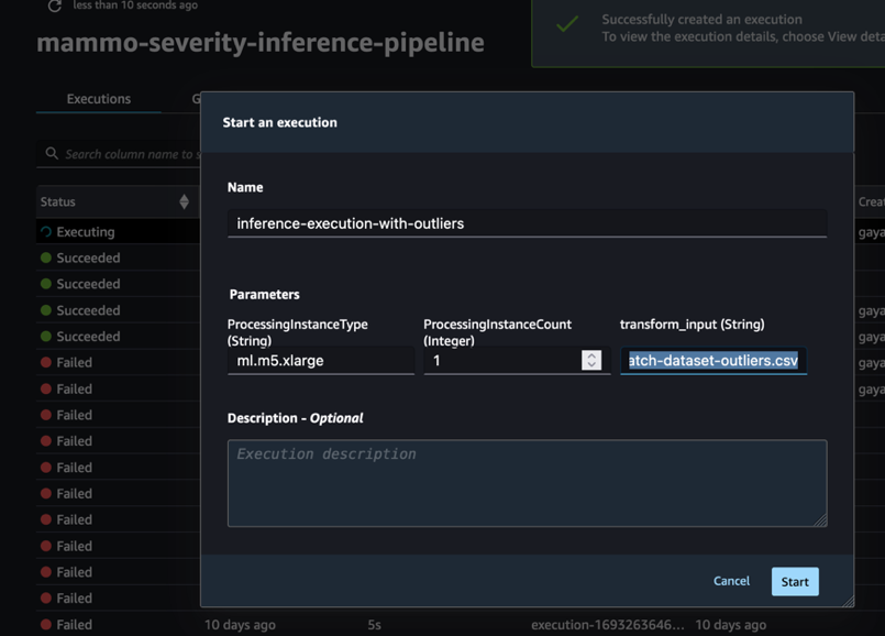 Run the pipeline via the SageMaker Pipelines console in the SageMaker Studio domain of the prod account, where the transform_input will be the S3 URI of the dataset without outliers (s3://<s3-bucket-in-prod-account>/mammography-severity-model/data/mammo-batch-dataset.csv).