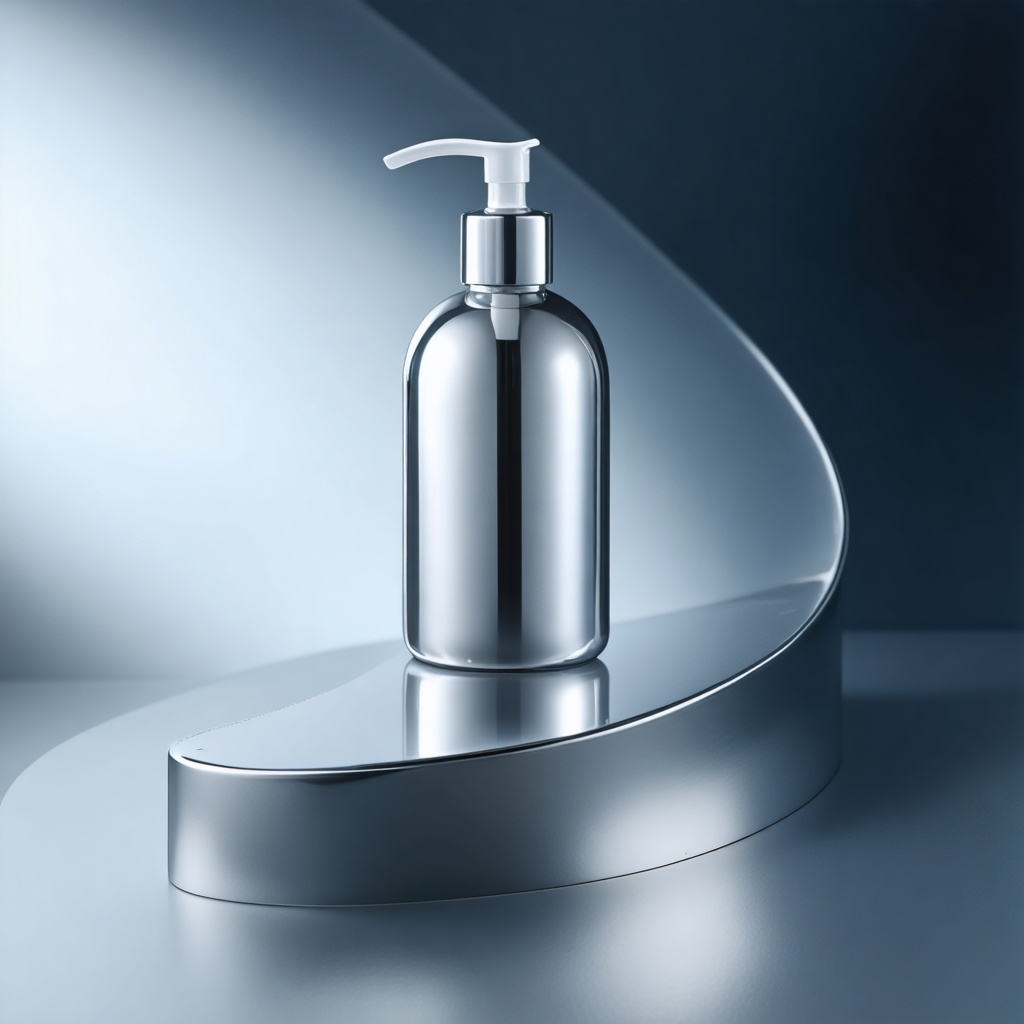 Prompt “product shot of a silver hair oil bottle with soft reflections on curved chrome, (depiction of Wes Anderson style:1.2), under cold studio lighting” |