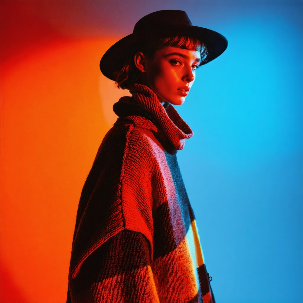 Prompt “fashion editorial of a model in layered knitwear, dramatic colored lighting, strong shadows, high ISO texture” |