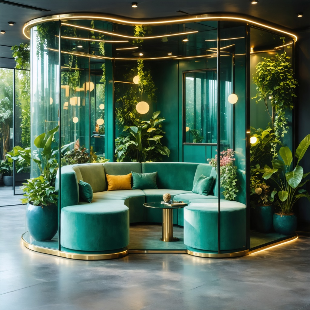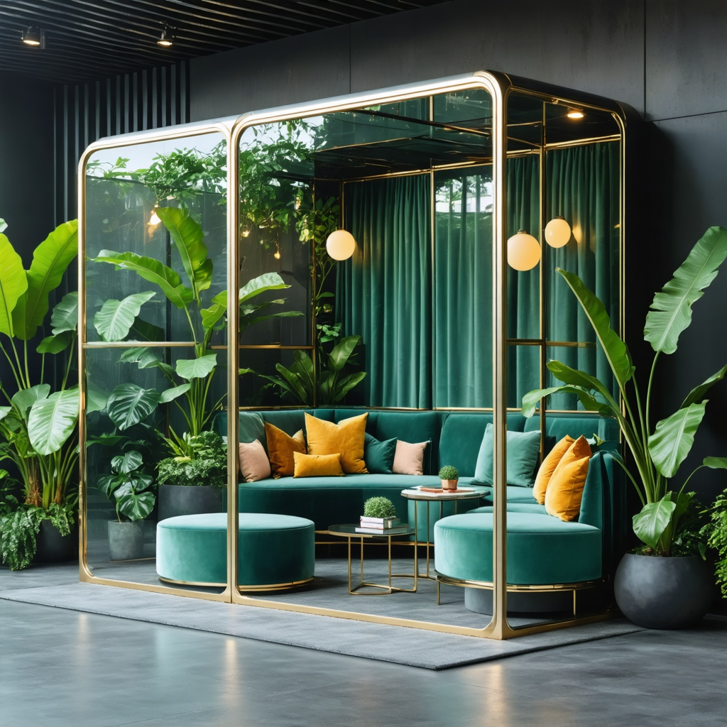 Without Negative Prompt | Prompt “(medium full shot) of (charming office cubicle) made of glass material, multiple colors, modern style, space-saving, upholstered seat, patina, gold trim, located in a modern garden, with sleek furniture, stylish decor, bright lighting, comfortable seating, Masterpiece, best quality, raw photo, realistic, very aesthetic, dark “ |