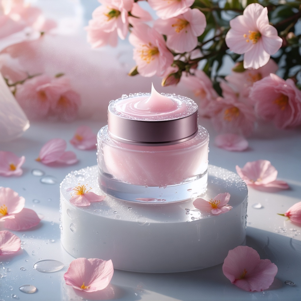 Prompt with weights “editorial product photo of (a translucent gel moisturizer jar:1.4) placed on a (frosted glass pedestal:1.2), surrounded by (dewy pink flower petals:1.1), with soft (diffused lighting:1.3), subtle water droplets, shallow depth of field” |