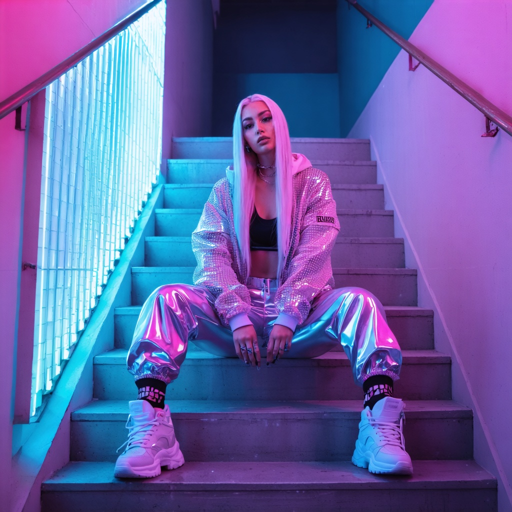Prompt “studio portrait of a model with platinum hair in metallic cargo pants and a cropped mesh hoodie, seated with legs wide on (acrylic stairs:1.6), magenta and teal gel lighting from left and behind, dramatic contrast, shot on 50mm, streetwear editorial for Gen Z campaign” Negative prompt “blurry, extra limbs, watermark, cartoon, distorted face missing fingers, bad anatomy” |