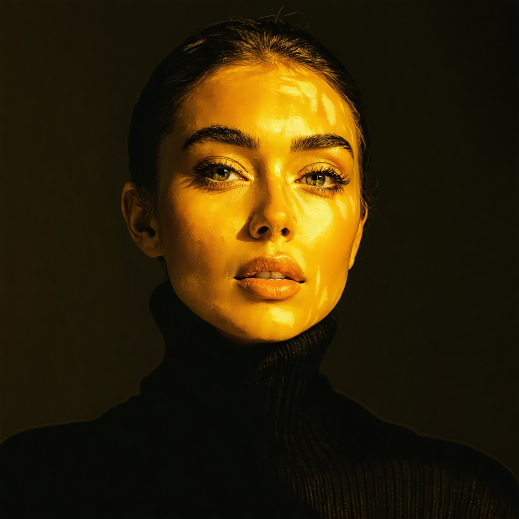 Prompt “editorial studio portrait of a woman with glowing skin in minimalist glam makeup, high-contrast lighting, clean background, (depiction of Van Gogh style:1.3)” |