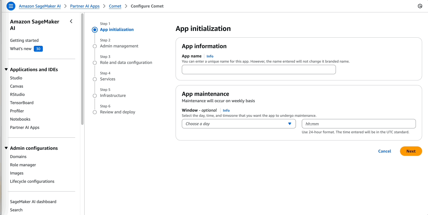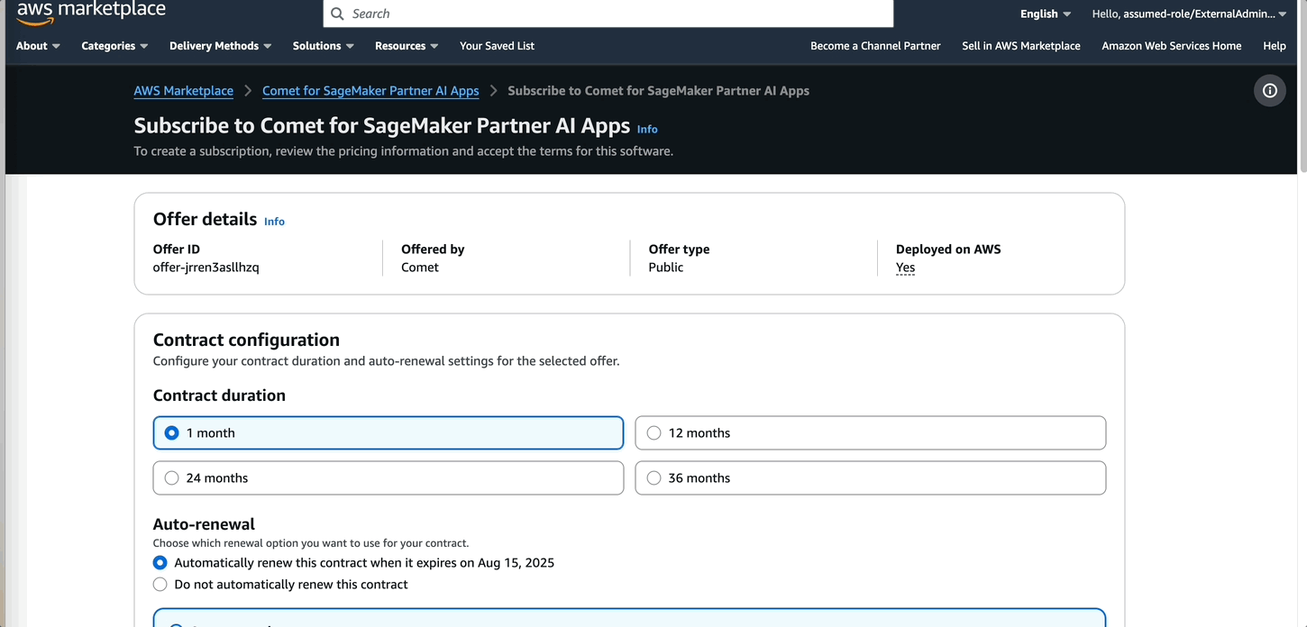 - Follow the prerequisites to set up Partner AI Apps. This sets up permissions for administrators, allowing Comet to assume a SageMaker AI execution role on behalf of the users and additional privileges for managing the Comet subscription through AWS Marketplace.