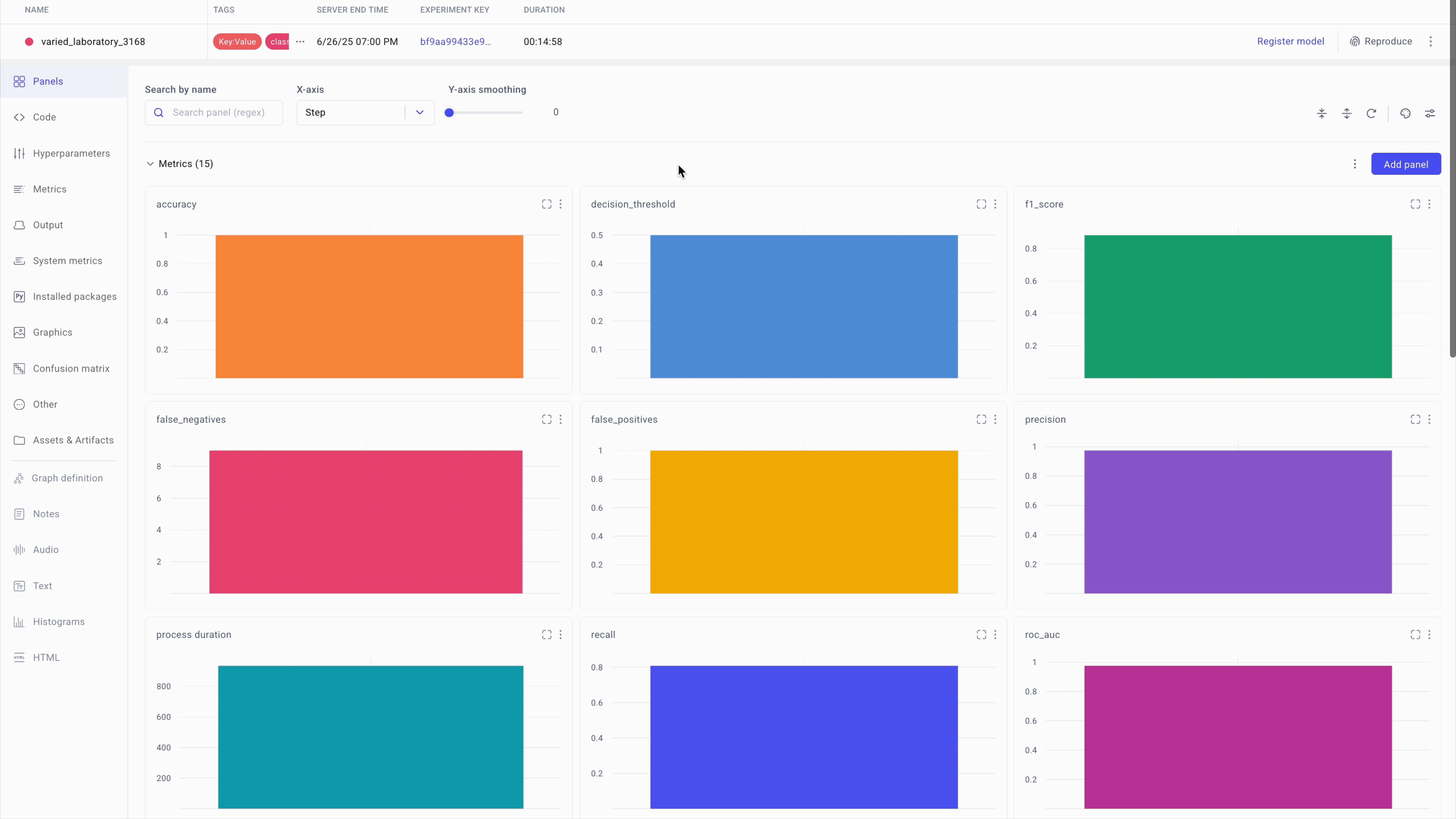 The following screenshot shows the Comet experiments UI. The experiment details are for illustration purposes only and do not represent a real-world fraud detection experiment.