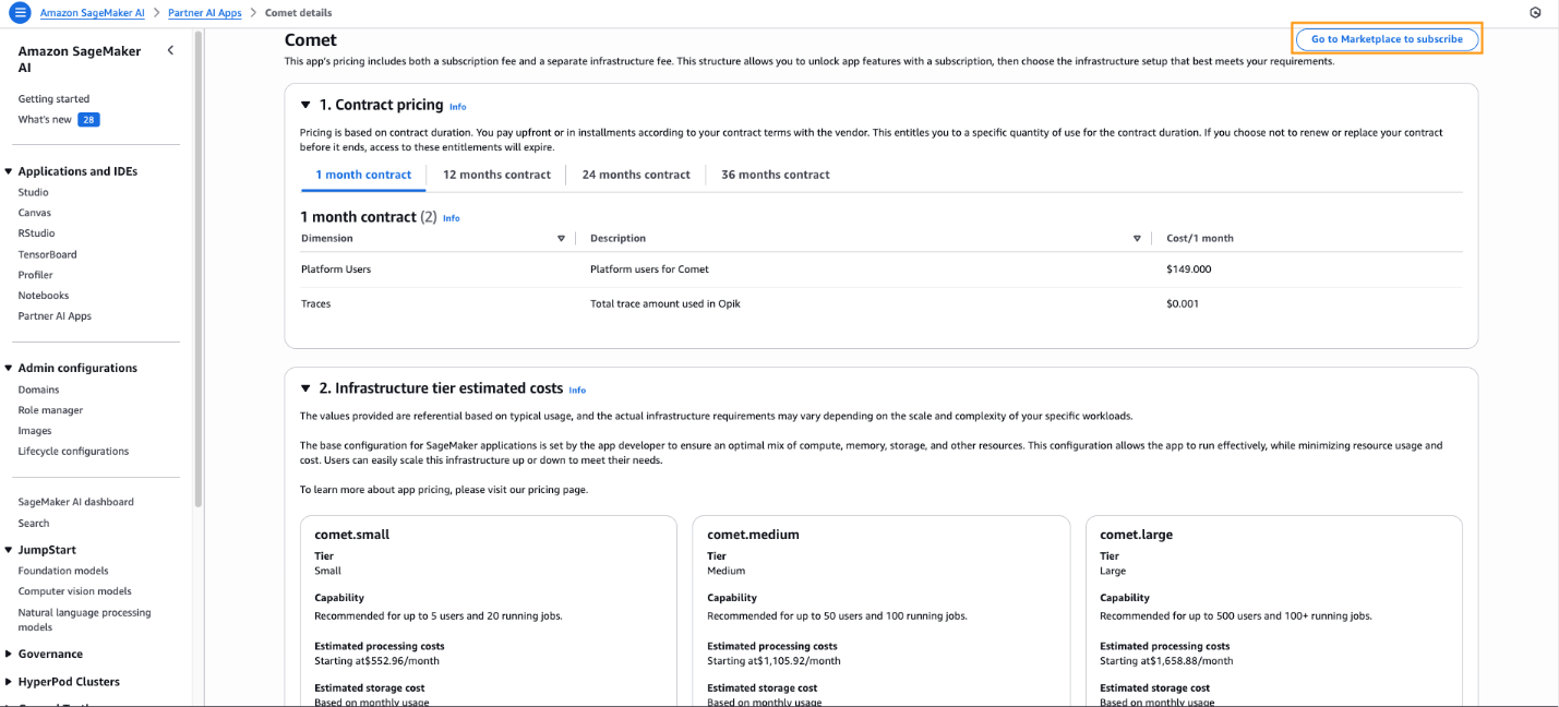 - Choose Go to Marketplace to subscribe to be redirected to the Comet listing on AWS Marketplace.