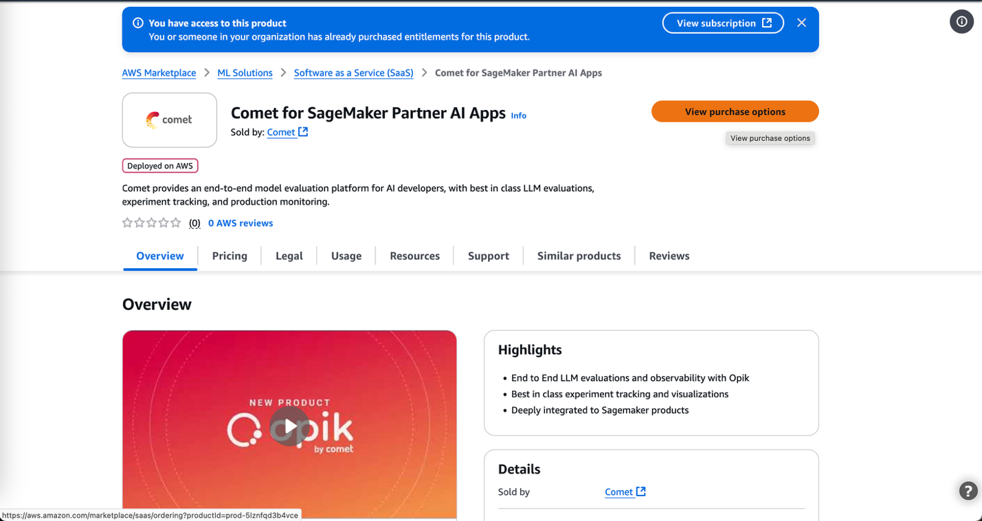 Comet is available in SageMaker AI as a Partner AI App, as a fully managed experiment management capability, with enterprise-grade security, seamless workflow integration, and a straightforward procurement process through AWS Marketplace.